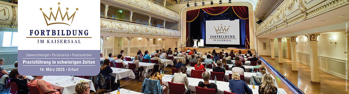 Für die „Fortbildung im Kaisersaal“ am 14. März 2026 hat unsere Landeszahnärztekammer Thüringen das aktuelle Thema „Praxisführung in schwierigen Zeiten“ gewählt: Wir alle stehen täglich vor den Auswirkungen des Zahnärztemangels in Thüringen. Immer weniger Praxen müssen immer mehr Patienten bewältigen. Welche Stellschrauben haben wir selbst, um eine gute Praxisführung bei begrenzten personellen Ressourcen und steigenden Kosten zu organisieren? Wie können wir unsere Praxen wirtschaftlich tragfähig – aber ohne Selbstausbeutung – erfolgreich weiter führen?