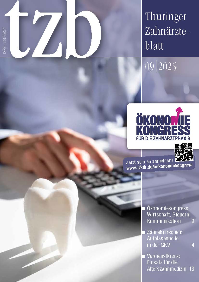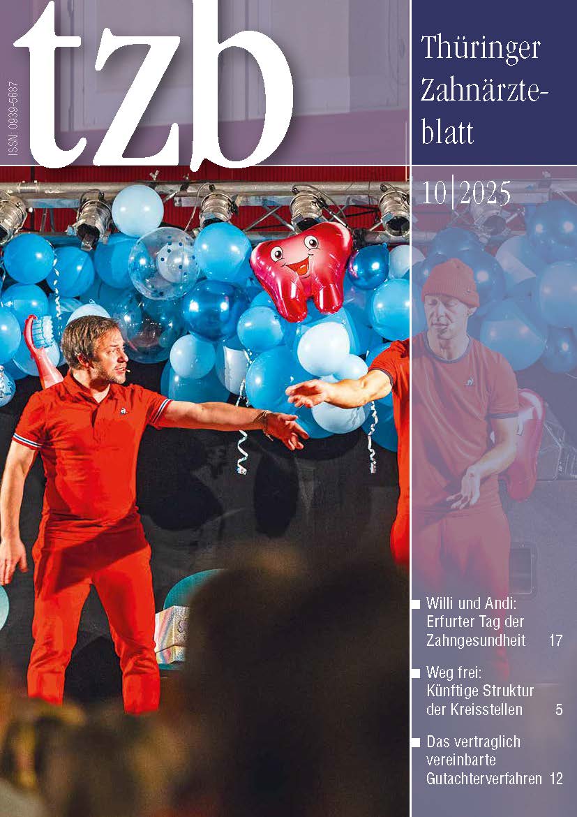 Das Thüringer Zahnärzteblatt ist das offizielle Mitteilungsblatt der Landeszahnärztekammer Thüringen und der Kassenzahnärztlichen Vereinigung Thüringen. Die Zeitschrift berichtet monatlich über das vielfältige zahnärztliche Leben und interessante Themen der Zahnmedizin im Freistaat.